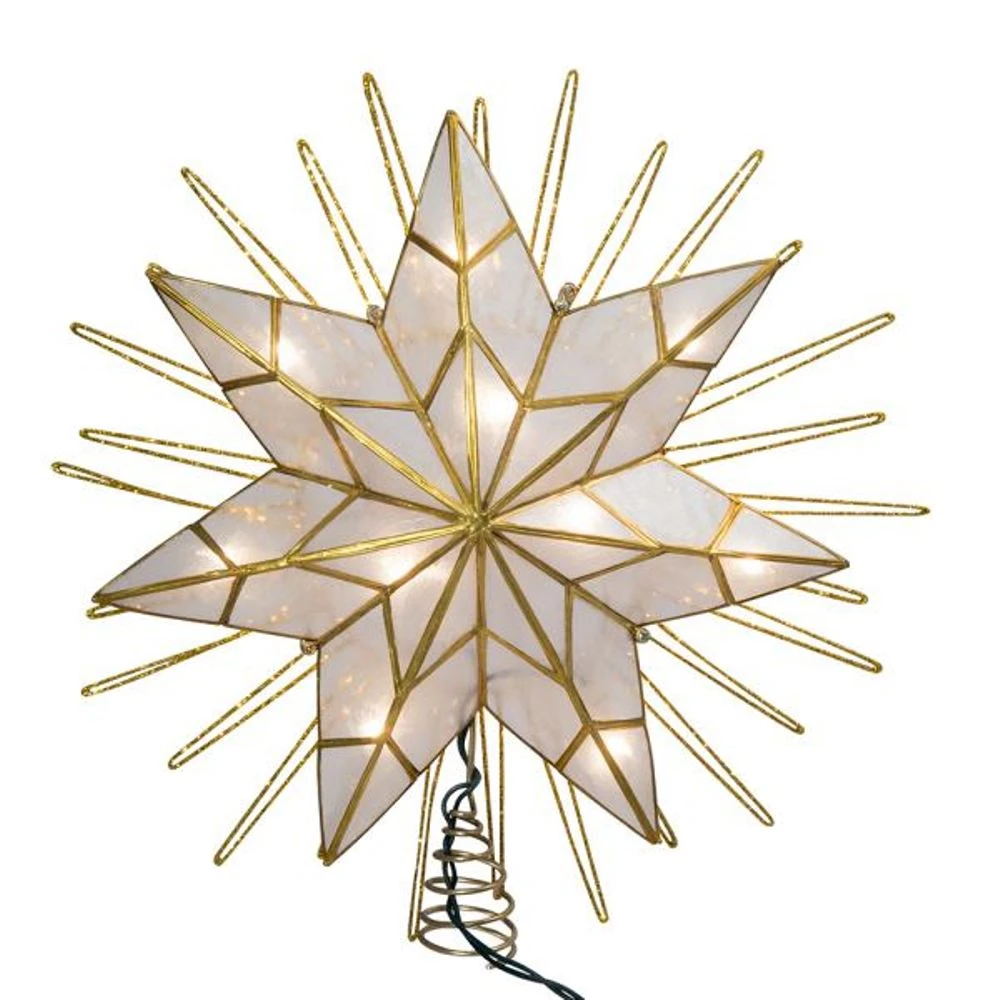 This 7-point natural capiz star lighted treetop is a beautiful way to accent the lighting and décor of your Christmas tree. Featuring a large 7-point star made of natural capiz giving it a frosted look, framed by several surrounding wire ray accents, this bright star has a glittery gold-plated finish.