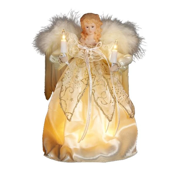 This ivory and gold angel treetop is a classic way to add to your Christmas tree. Dressed in a long, ivory dress adorned with gold trimming and detailing, this angel has white feathery wings, long hair and is holding two candles that light up.