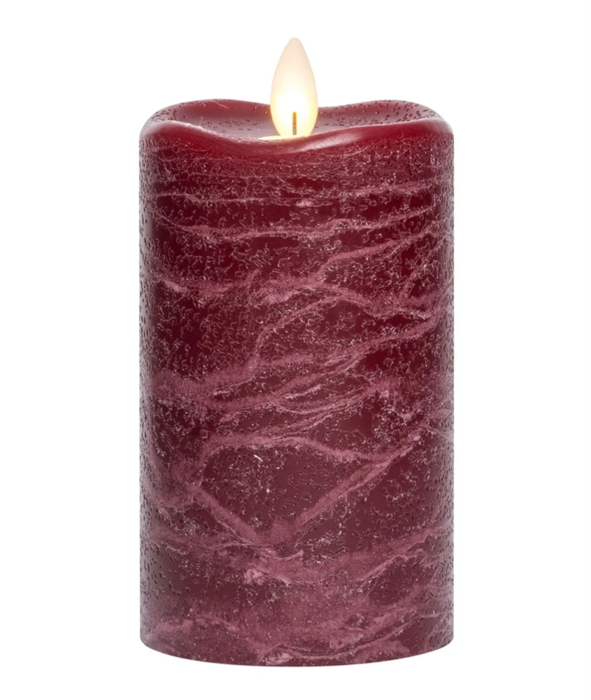 Warm up your home with a Mirage Gold Flameless Candle in burgundy from Christmas Tree Hill. The beautiful candle has all of the charm of a wax candle without the risk of an open flame. Featuring a stunning cracked burgundy exterior, the pillar candle makes a fantastic accent to your home decor. Use a flameless pillar candle in your favorite holiday centerpiece, in an outdoor lantern or on a candle holder to add ambiance to any indoor space.
