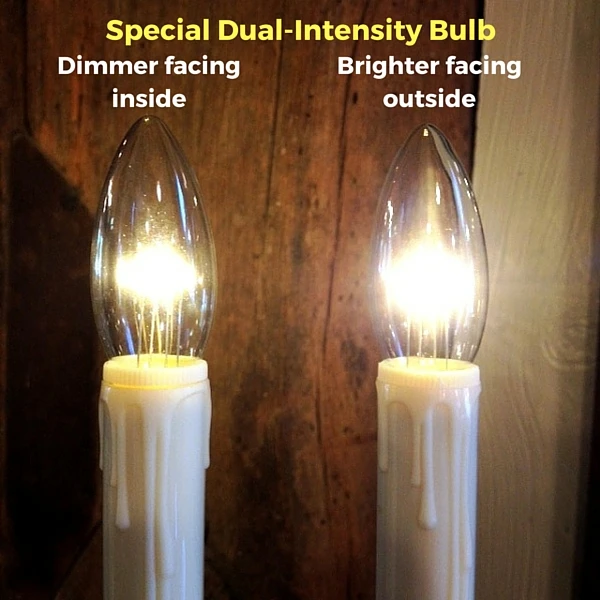 - Dual-intensity LED so candle shines brightly outside and softly inside