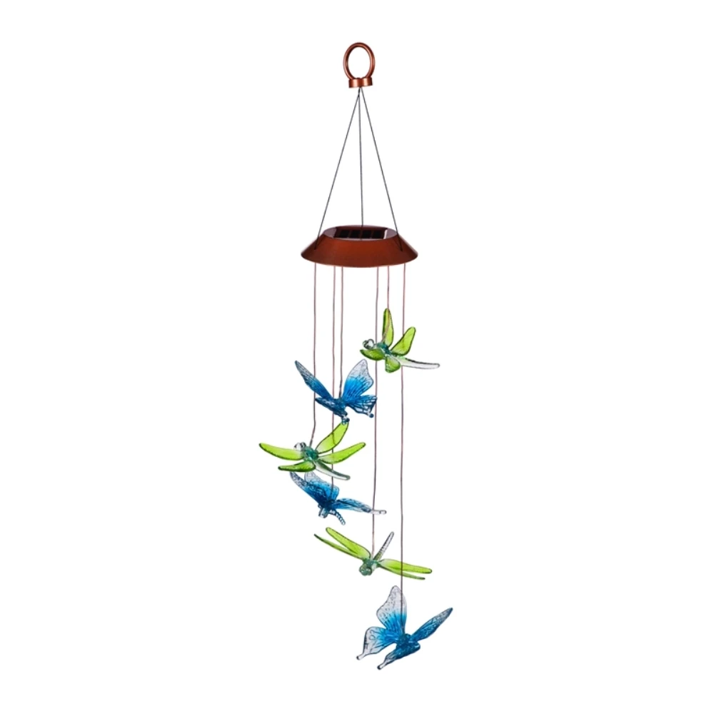 Solar Wind Chime – This solar powered mobile is perfect for the summer. Featuring a color-changing dragonflies and butterflies when lit, this piece can be hung in any covered area: indoors or outdoors. The light automatically turns on in the dark and turns off in the light. Battery included.
