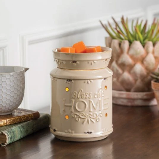 - DESIGN: A French country style ceramic warmer with debossed “Bless this Home” in vanilla cream.